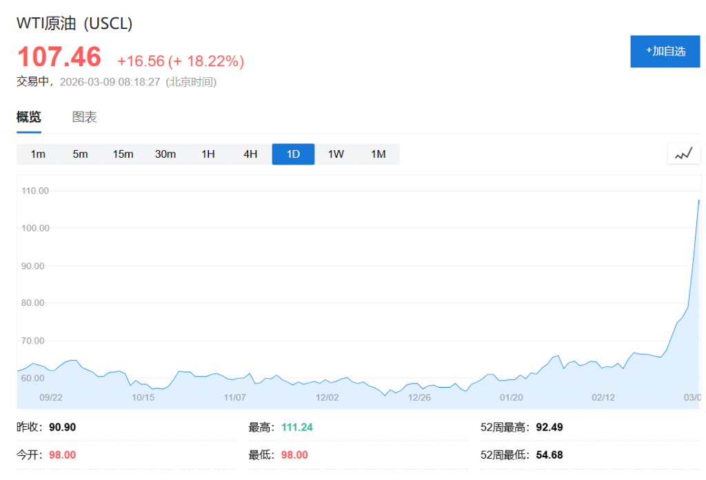 3月9日周一,受霍尔木兹海峡航运受阻与中东主要产油国减产影响,WTI原油和布伦特原油双双飙升。WTI原油一度上涨22%突破110美元,创下自2022年以来的最高水平。与此同时,美国天然气期货价格亦创下一个月新高。
