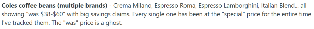还有Coles多款咖啡豆产品,例如Crema Milano、Espresso Roma、Italian Blend等,都长期标注“原价$38至$60,现在特价”。