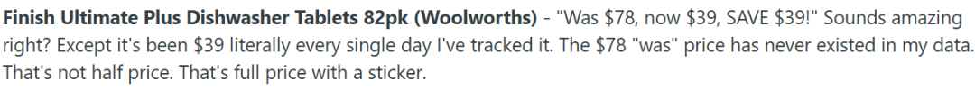 例如,Woolworths销售的一款Finish Ultimate Plus洗碗机清洁片(82粒装),在促销标签上写着“原价$78,现在$39,立省$39”。