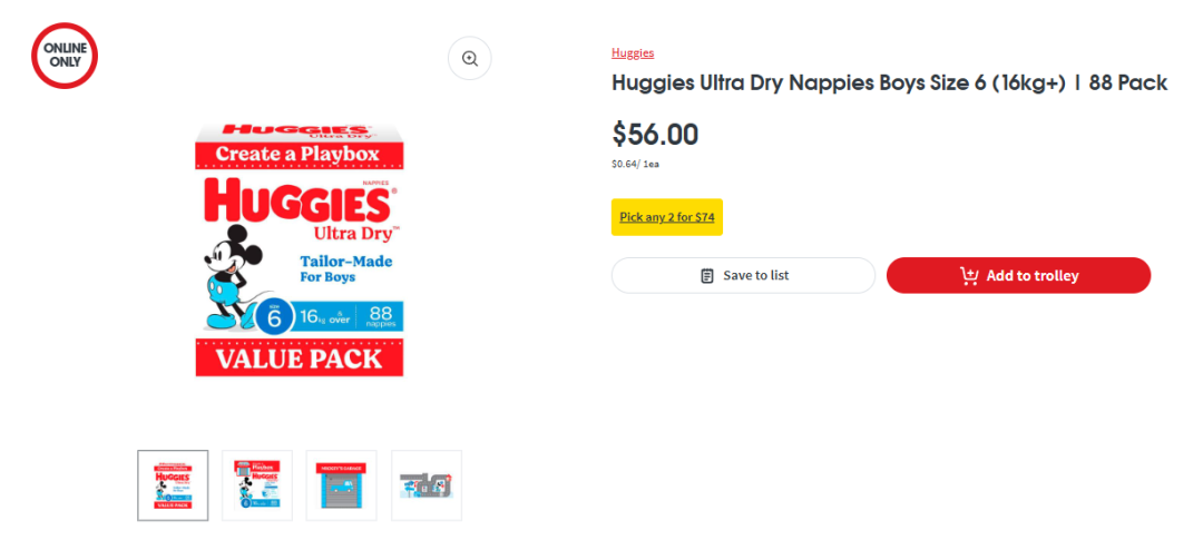 例如Coles销售的一款Huggies Ultra Dry纸尿裤(6号),标签显示“特价$38,原价$56,立省$18”。