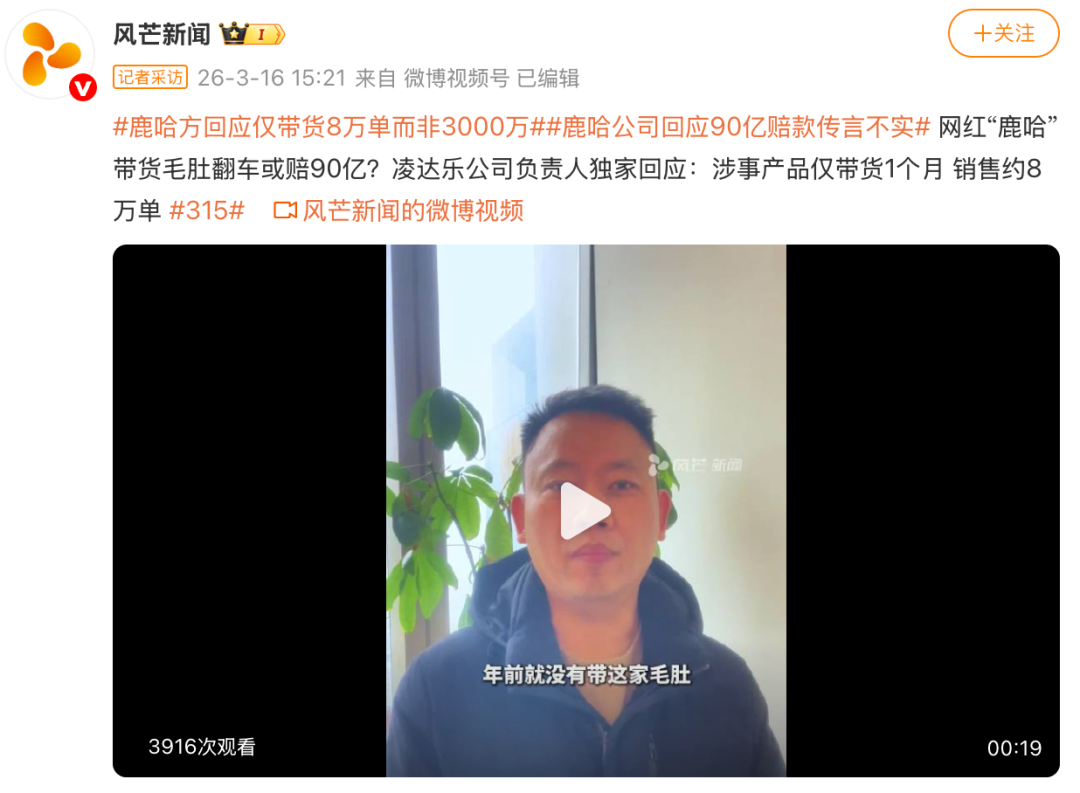 据湖南都市频道风芒新闻16日报道,凌达乐公司负责人回应称:涉事产品仅带货1个月,销售约8万单,网传说法太夸张。