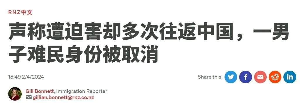 2024年,新西兰就有中国男子因疑似虚假申请,难民身份被取消。
