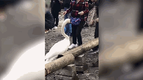 事发地点两米处就有“禁止投喂”的英文标示牌,而这位大妈不仅视而不见,还对无辜的天鹅下手这么狠……