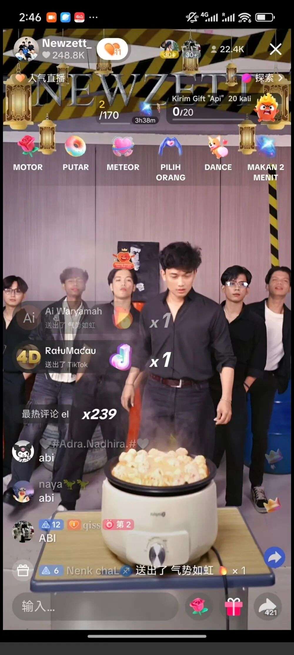 那场直播玩法其实比较简单,印尼人吃饭不用筷子,我们就让他们用筷子吃火锅,夹起来食物又很烫,还没吃到嘴里礼物触发了,他们又只能跳舞,所以整体看起来过程又滑稽又魔性。