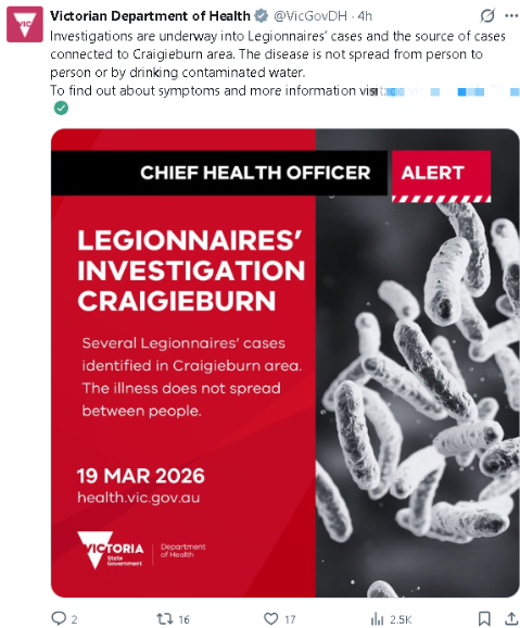 目前确认是在Craigieburn以及周边区域,已经有6人确诊感染“军团菌病”,而且全部都在3月初出现症状,