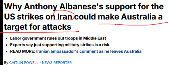 称澳洲的支持行为已让其成为伊朗的潜在报复目标。
