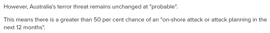 这意味着在未来12个月内,澳洲本土发生袭击或企图袭击的可能性已超过50%。