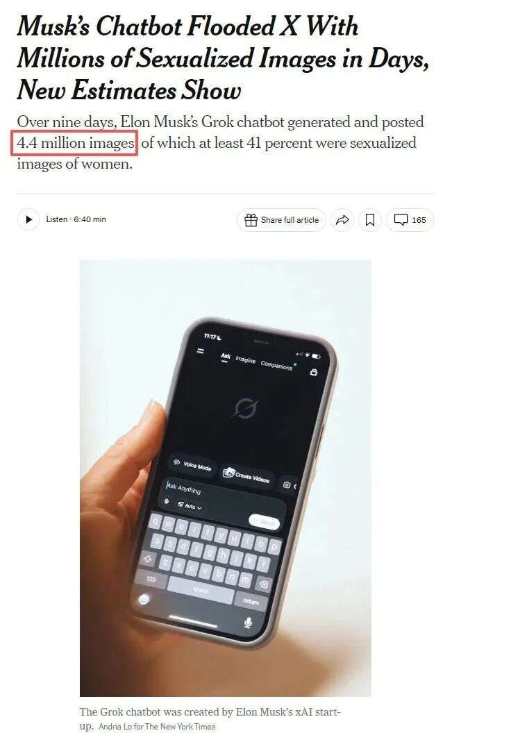 据《纽约时报》统计,当时Grok在九天内生成了440万张图片,其中至少41%,是色情化的女性照片。