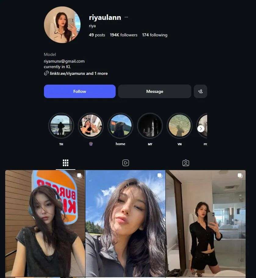 举个例子,其中一个被TikTok封禁的账号,盗用了模特Riya Ulan的视频。Riya是马来西亚人,纯亚洲人肤色,结果经过AI上色,她变成了这样: