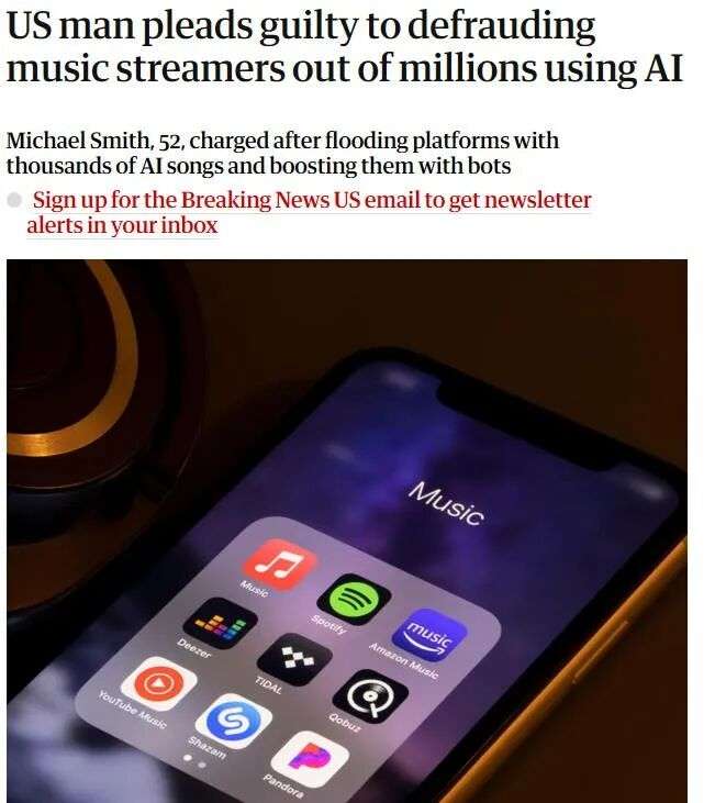 他用AI生成了数十万首歌曲,再用一千多个机器人账号循环播放,七年骗走超过800万美元版税。