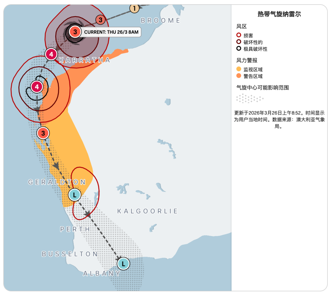 3月26日,这个气旋在一夜之间增强至三级,正沿着西北海岸向南一路“横扫”,预计本周末将给珀斯及周边地区带来强风和明显降雨。