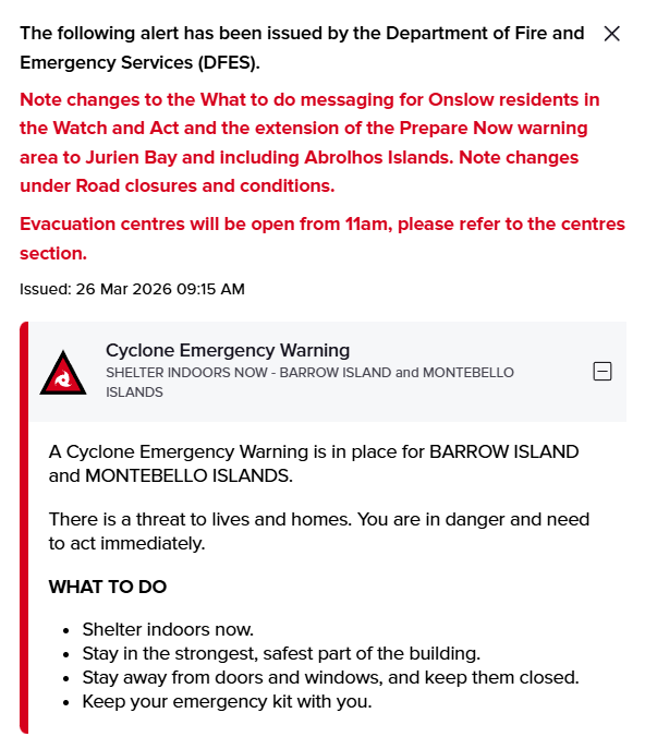 届时,Pilbara海岸及周边岛屿将感受到极具破坏力的强风,Karratha、Roebourne 和 Port Hedland等地预计将在夜间遭受风速超过每小时80公里的狂风袭击。