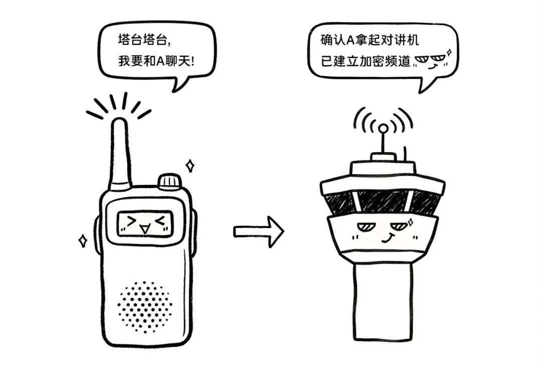 简单来说:用对讲机喊话得先申请临时私密频道。当你发起聊天,对讲机会向指挥塔申请对接;