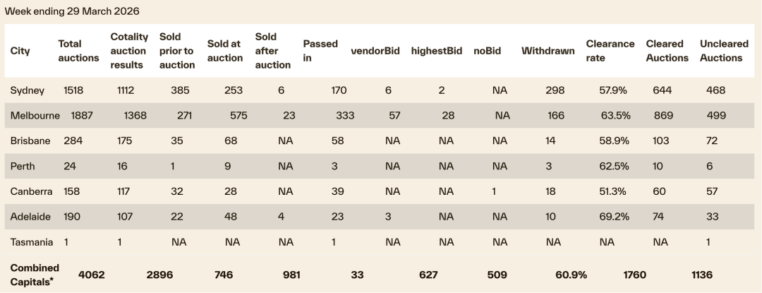 从各城市拍卖表现来看,悉尼清盘率降至57.9%,墨尔本为63.5%;阿德莱德为69.2%,布里斯班为58.9%,珀斯为62.5%。