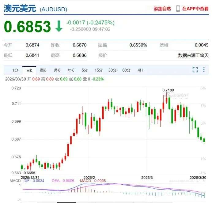 从周度走势来看,澳元兑美元汇率从周初的0.7000附近持续下探,截至今天已跌至0.6850附近,跌幅明显。