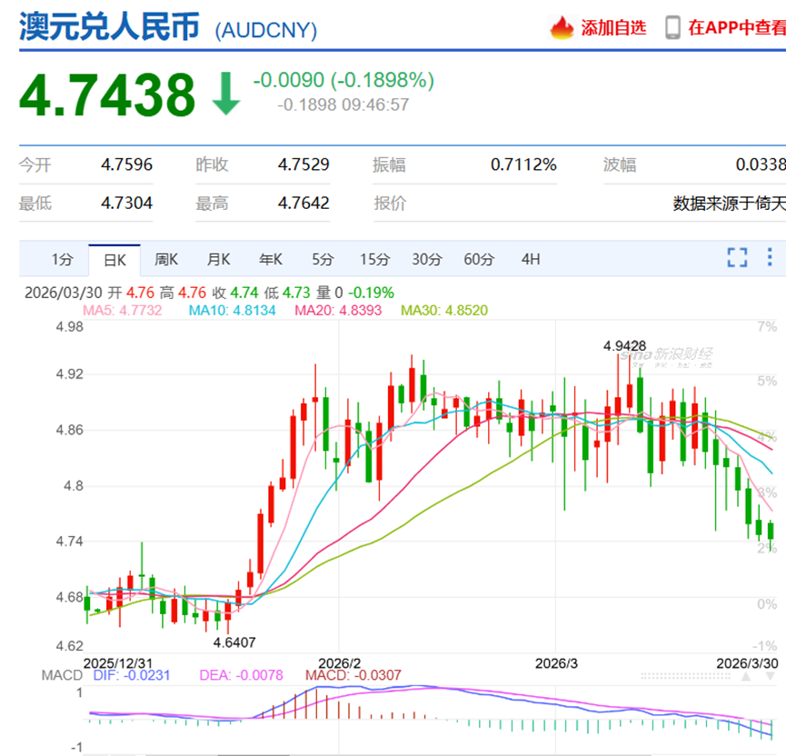 澳元兑人民币也连跌数日,今早跌至4.74。