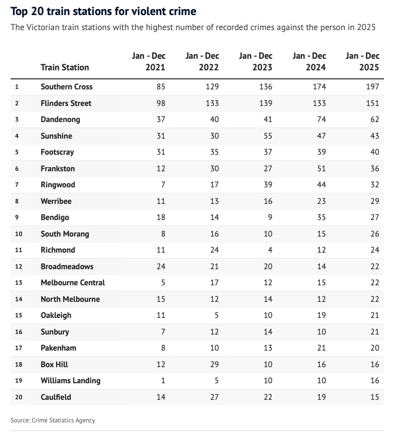 Southern Cross车站2025年共记录197起案件,为全州最高。