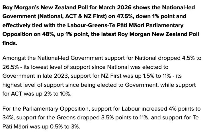 最新Roy Morgan三月民调显示,国家党支持率仅为26.5%,创下自2023年大选以来的新低;