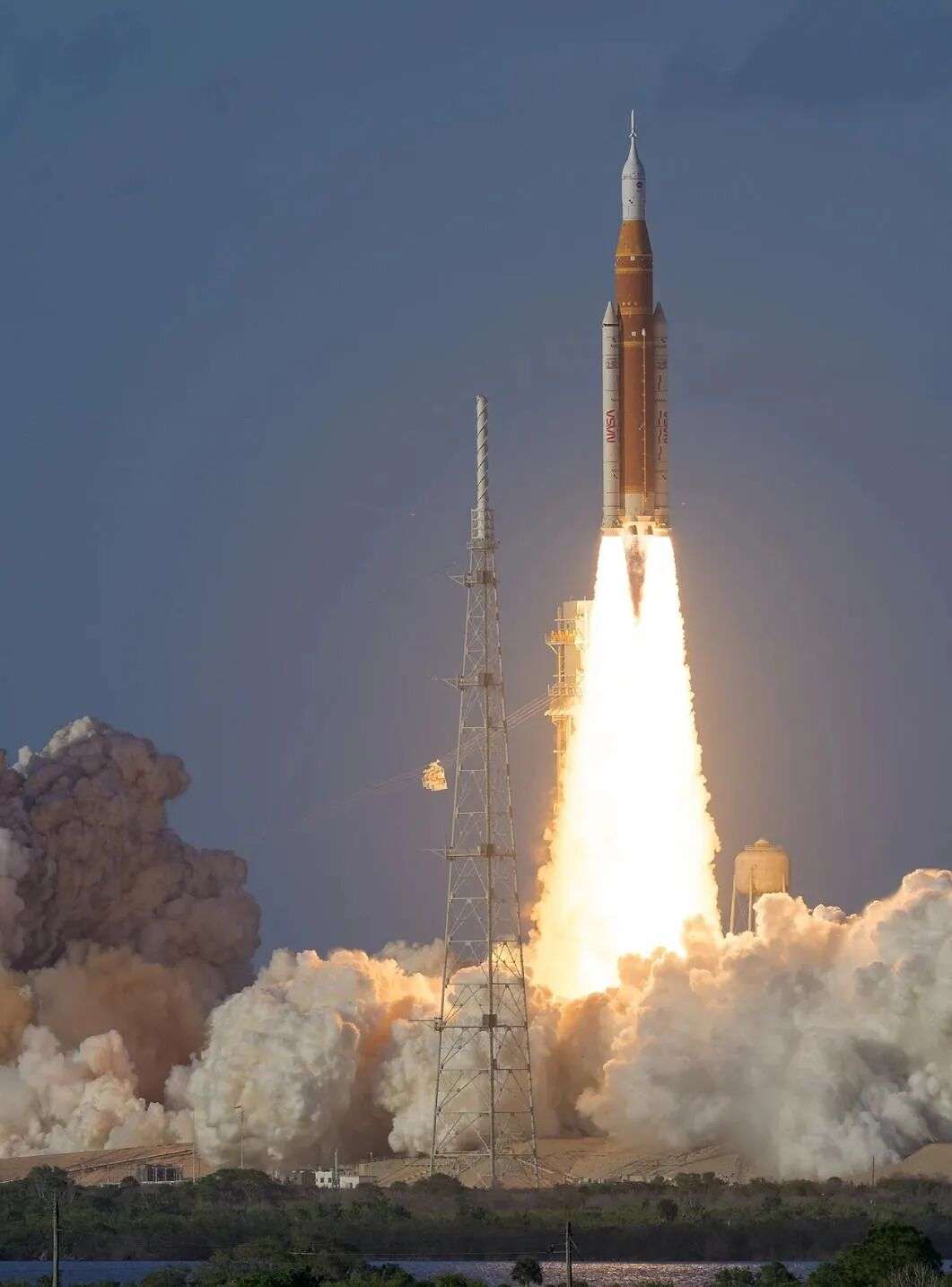 下午6点35分,火箭的四台发动机和两枚固体火箭助推器同时点火,产生了880万磅(约4000吨)的推力。渐暗的蓝色天空瞬间照亮成耀眼的白色。