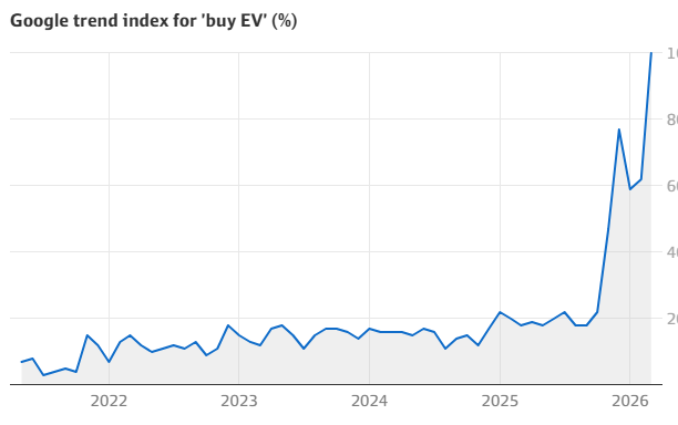 公司称,自从伊朗冲突导致油价大涨后,越来越多消费者开始提前考虑换电动车。