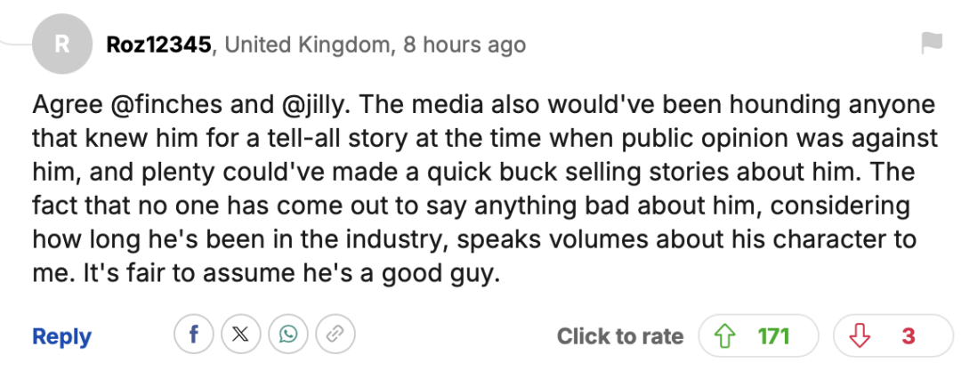 “我完全赞同 @finches 和 @jilly 的看法。当时舆论对他极为不利,媒体肯定会紧盯每一个认识他的人,试图挖掘出所谓的‘独家爆料’;