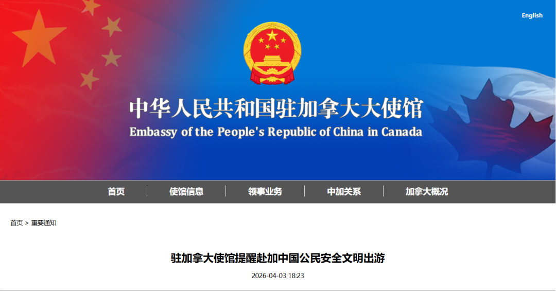4月3日,中国驻加拿大大使馆发布通知,提醒赴加中国公民安全文明出游。全文如下: