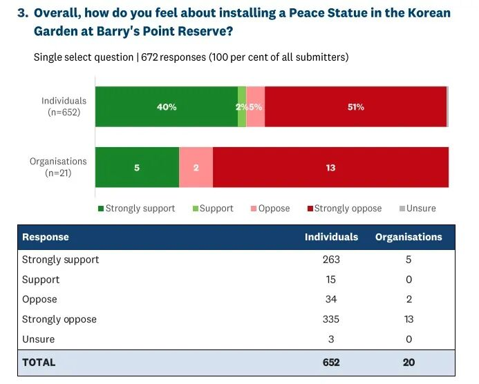 咨询共收到672份意见,结果显示:57%的个人及20个组织中的13个反对竖立雕像;43%及其中5个组织表示支持。