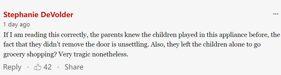 “我要是没理解错的话,这对父母明明早就知道2个孩子经常会在冰柜里玩耍,但没有拆掉柜门,这一点实在让人觉得有点诡异。而且,他们竟然为了买东西把2个小孩子独自留在家中?不管怎么说,这都是一场彻头彻尾的悲剧。”