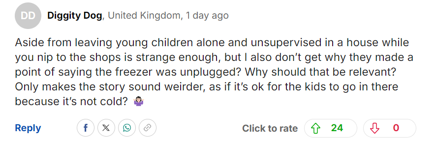 “为了买东西就把2个年幼孩子扔家里没人看管,这点就很离谱之外,我更不理解他们为什么非要特意强调冰柜是断电的?这点有什么着重提及的必要吗?难道就因为不制冷,孩子钻进去就没事了吗?提这点只会让人觉得整件事更诡异、更不对劲罢了。”