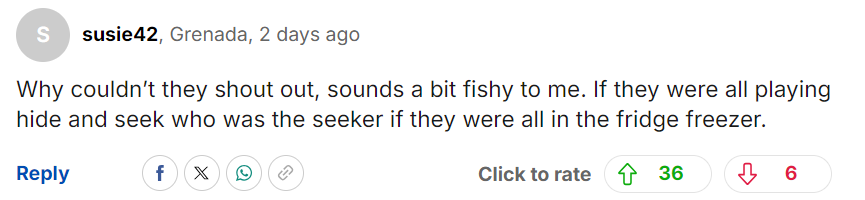 “他们难道没有大声呼救吗?我听着这点就觉得很可疑。而且他们如果是在玩捉迷藏,那两个人都躲进冰柜里了,谁来当找人的那个呢?”