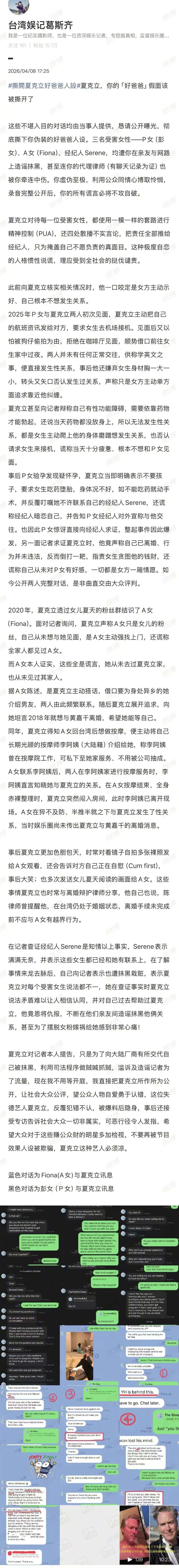 不止一个受害者。葛斯齐晒出了P女、A女,还有夏克立的前经纪人Serene。三个人遭遇几乎一模一样——被撩、被睡、被甩锅,最后还被反咬一口说女方贪财纠缠。