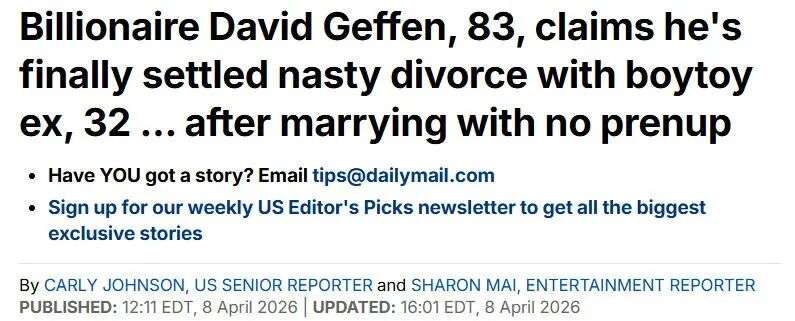 最近,“梦工厂”的创始人之一、83岁影视业大亨大卫·格芬(David Geffen),跟32岁前任“小娇夫”大卫·阿姆斯特朗【David Armstrong,又名多诺万·迈克尔斯(Donovan Michaels)】旷日持久的离婚大战,在拉扯一年后终于落下帷幕。