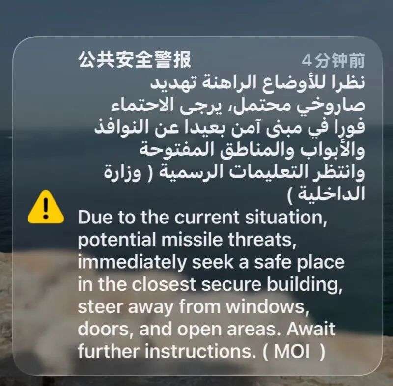 “我们家是在迪拜郊区,原先我老公上班通勤需要在两地往返。回去后他有一天甚至连续收到了5次防空警报,我很担心,就给他定了酒店让他不要再跑来跑去了。”Fiona回忆,即便风险高悬,当时丈夫所在公司曾要求员工到岗办公,“办公楼里有公司被列入所谓的‘攻击名单’,现在想起来都觉得不合理。”