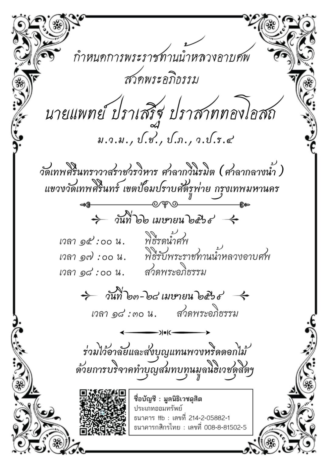 根据安排,巴瑟医生的皇家赐水沐浴遗体仪式将在曼谷蓬巴沙都拍区的德瓦西林寺举行,地点为该寺水上礼堂。